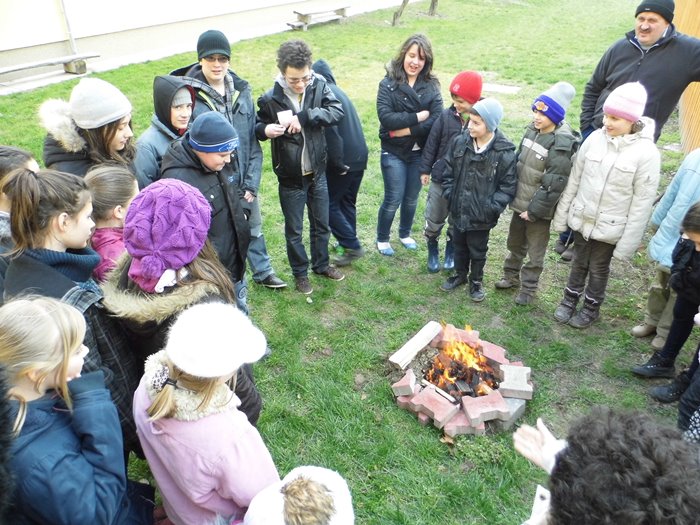 A kész bábukat az udvaron elégettük. A zord időjárás ellenére sikerült kicsi tábortüzet rakni. A tűznél Major Hunor hagyományos szöveget kántált, amit a jelenlévők megismételtek.
